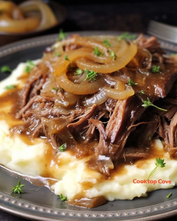 Serve the French Onion pot roast with the flavorful sauce over mashed potatoes or rice. Enjoy your delicious slow-cooked meal!