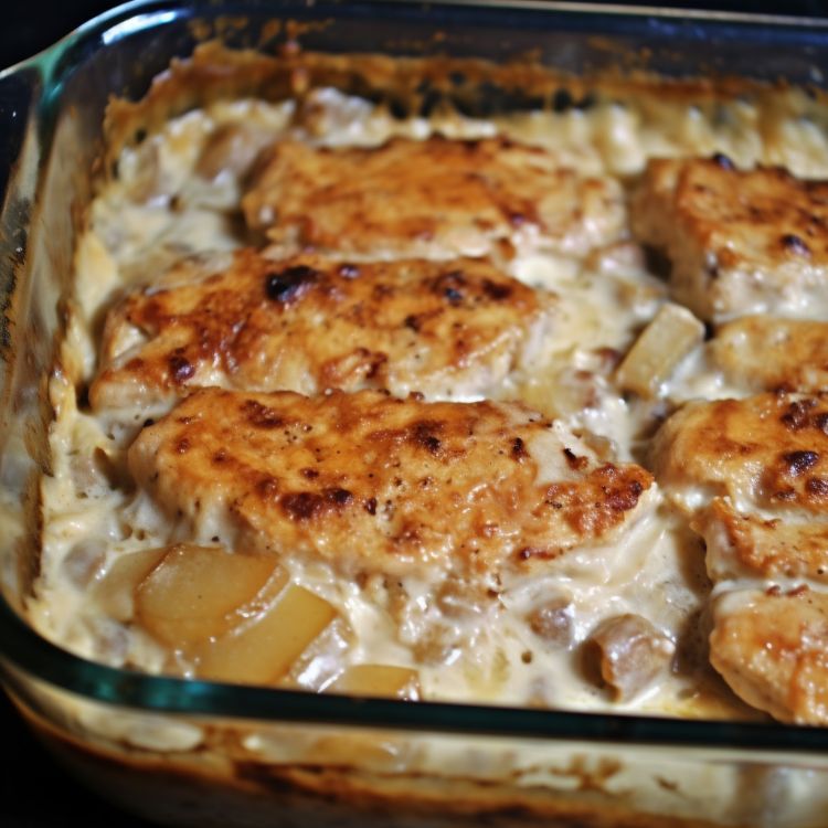 Let it cool slightly before serving. Enjoy your creamy pork chops and potatoes casserole!