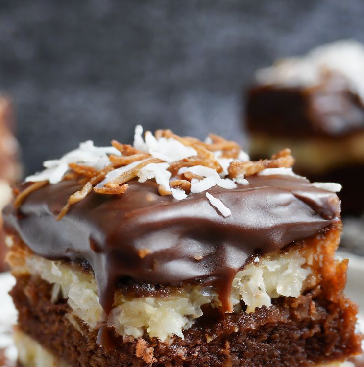 8. Heat the chocolate frosting in the microwave for about 20-30 seconds, or until it reaches a pourable consistency. Pour the frosting evenly over the coconut layer.