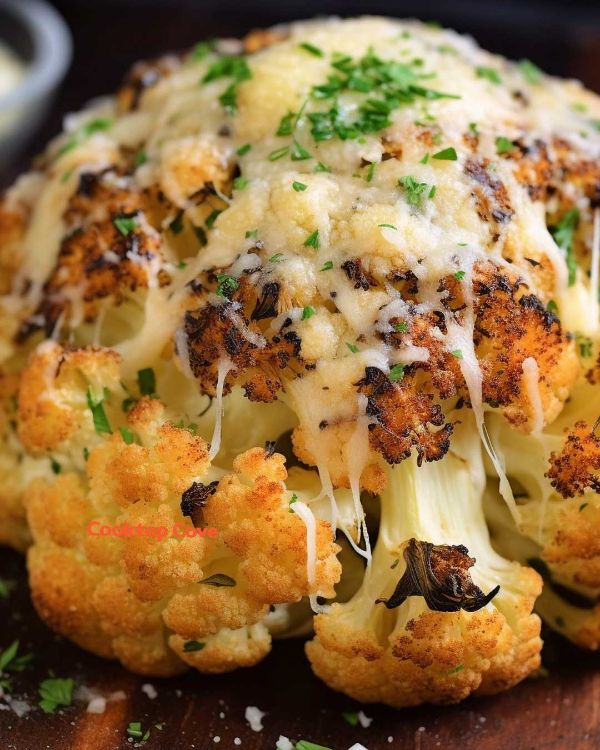 8. Return the cauliflower to the oven for an additional 10-15 minutes, or until the cheese melts and forms a golden crust.
