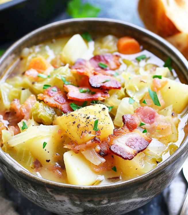 Irish Bacon Cabbage and Potato Soup is a hearty and traditional Irish dish that embodies the comforting flavors of Ireland. This soup, often made to warm up during cold weather, combines the earthy taste of potatoes, the savory flavor of bacon, and the mild sweetness of cabbage. It's a staple in Irish cuisine, reflecting the country's agricultural roots and the simplicity of its traditional cooking. This slow cooker version is especially convenient, allowing the ingredients to simmer gently and blend their flavors over time. This recipe is perfect for anyone wanting to experience a taste of Irish culture or seeking a satisfying and nutritious meal.