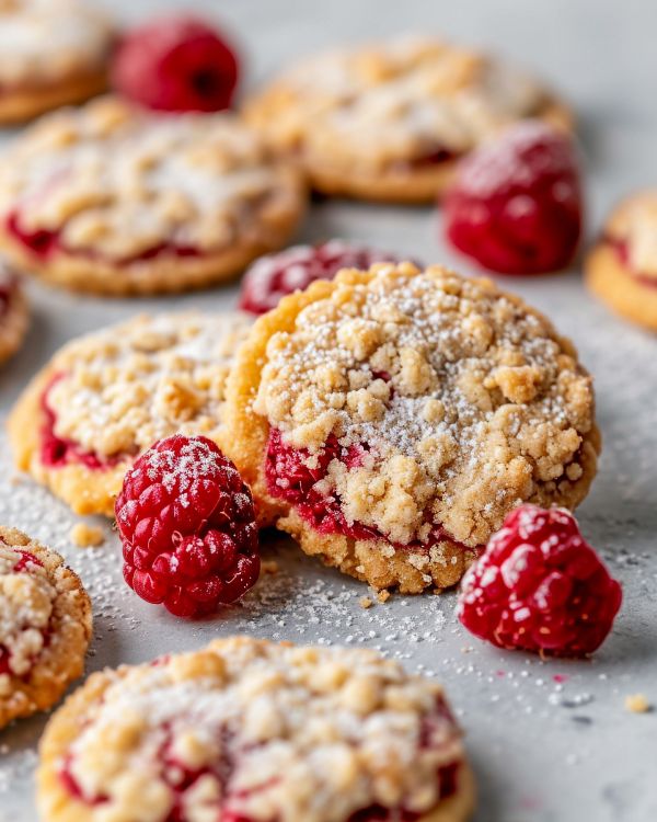 To make a friendly gathering even sweeter, serve these Raspberry Crumble Cookies with a side of homemade vanilla ice cream or a dollop of freshly whipped cream. For the grown-up pals, a steaming mug of coffee or a cup of tea makes a perfect companion. If it's a kid-centric affair, a glass of cold milk stands as a classic pairing for these delightful cookies.