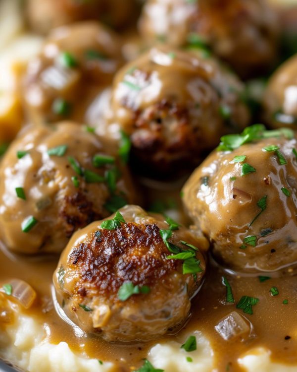 Nestled in the bountiful heartland, where the sweet whispers of tradition rustle through the long grass, a plate of Southern Meatballs with Sweet Onion Gravy is as comforting as a patchwork quilt on a crisp autumn day. This dish tells a tale as old as the South itself, one of families gathering at the end of a hard day's work to share a meal lovingly prepared by hands that follow recipes passed down through generations. For anyone in need of that warm, homely embrace only Southern cooking can provide, this recipe is a gift that unwraps the essence of home. It’s not just for the Southern palate, but for anyone who wishes to taste authentic, nostalgic, family-oriented cooking. The kind that speaks of heritage and simpler, slower times.
