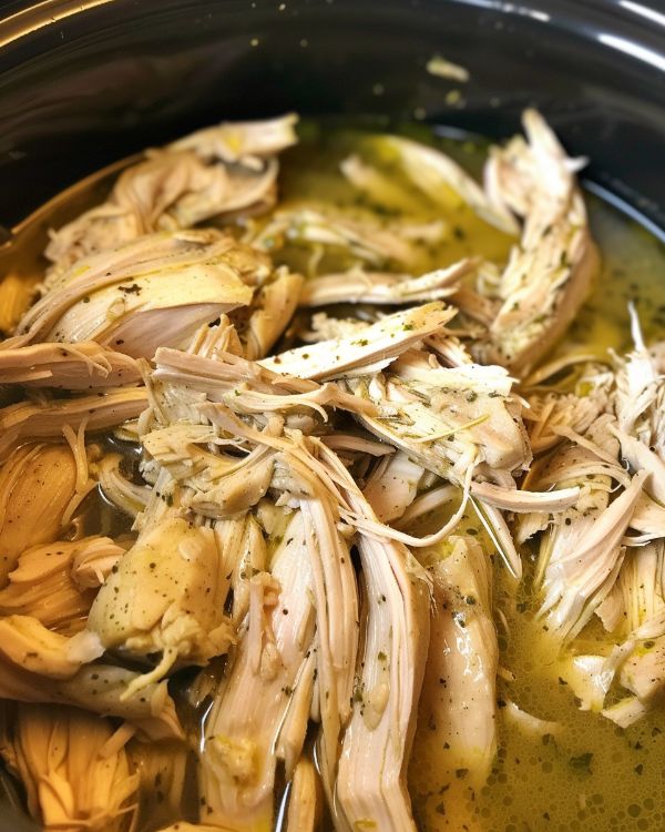 6. Shred the chicken with two forks in the slow cooker and mix it into the juices.