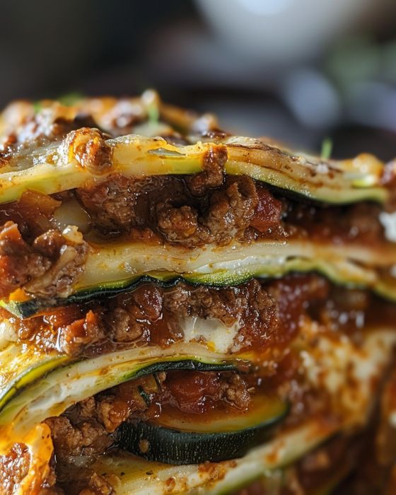 6. Now, let’s layer! In your baking dish, lay down a layer of zucchini strips, followed by a layer of the beef sauce, dollops of the ricotta mixture, and a sprinkle of mozzarella cheese. Repeat the layers until all ingredients are used, finishing with mozzarella.