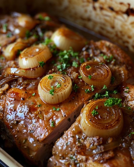 4. Pour the cooking liquid over the pork roast, ensuring some of it drips down to mingle with the onions.