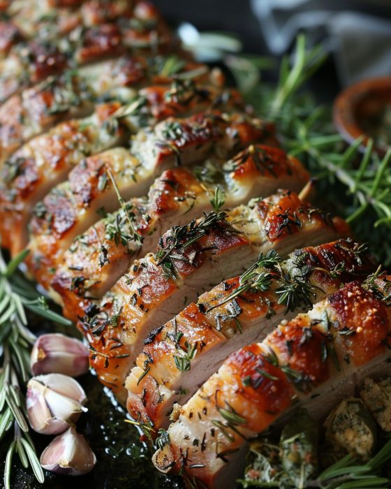 To complement the rich, savory flavors of the herb-stuffed pork loin, one might lean towards sides that provide a fresh contrast or soothing accompaniment. Consider a medley of roasted root vegetables, lightly buttered and herbed new potatoes, or a crisp, lemony arugula salad. For a heartier option, a wild rice pilaf accentuates the earthiness of the herbs, whereas a refreshing apple and fennel slaw can offset the pork's richness with its sweet tang.