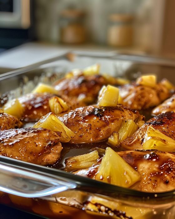 4. Pour the marinade over the chicken, ensuring each piece is evenly coated. Arrange the pineapple slices around the chicken.