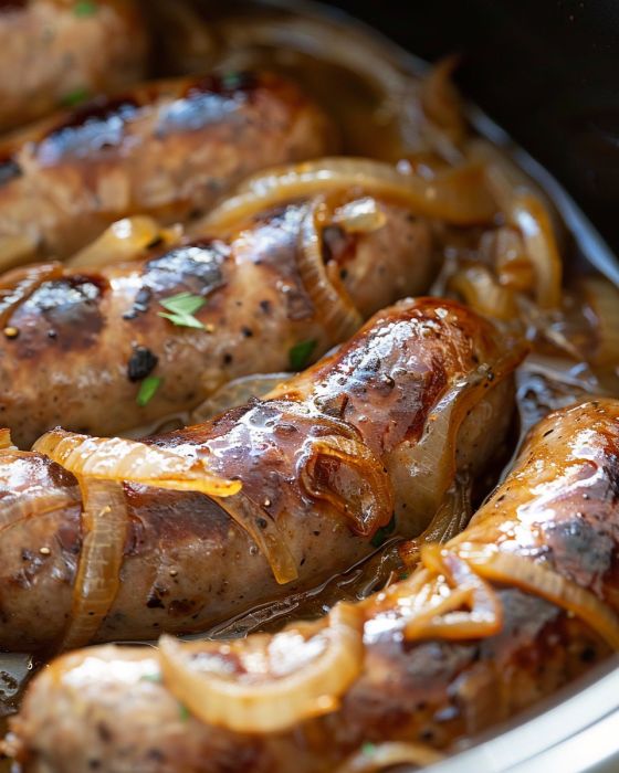 Slow Cooker Caramelized Onion Beer Brats