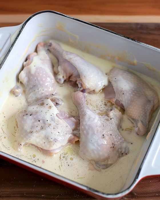 1. In a large bowl, soak the chicken pieces in buttermilk for at least 2 hours (or overnight for best results) in the refrigerator to tenderize the meat.