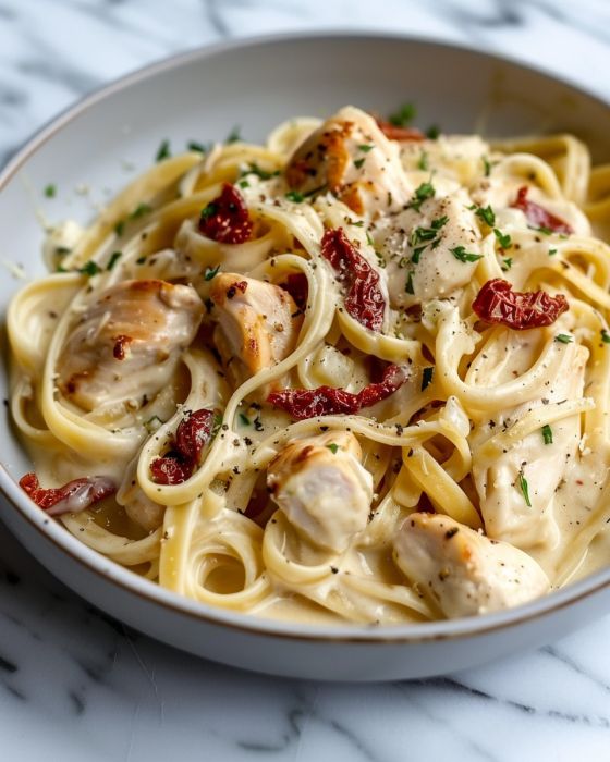 For those who like a bit of spice, add a pinch of red pepper flakes to the sauce for a little kick. If you have dietary restrictions, you can substitute the heavy cream with a plant-based creamer and use gluten-free pasta. For picky little eaters, you might want to keep the sun-dried tomatoes chunky so they can easily set them aside if they prefer.
