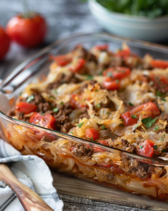 In a large casserole dish, layer half of the chopped cabbage, then half of the beef mixture. Repeat with the remaining cabbage and beef mixture.