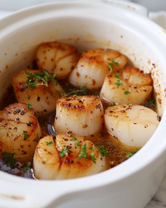 Once done, gently remove the scallops from the slow cooker and serve immediately.
