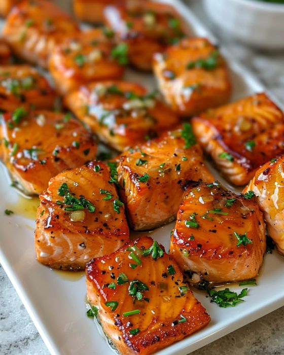 Honey butter garlic glazed salmon bites pair wonderfully with a side of buttery mashed potatoes and steamed green beans, offering a balance of creamy and crisp textures. A light, fresh salad with a tangy vinaigrette can also complement the sweet and savory flavors of the salmon. To round off the meal, consider serving some crusty bread to soak up any extra glaze and a glass of crisp white wine or iced tea.