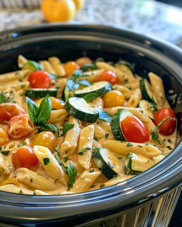 This Slow Cooker Creamy Pasta Primavera pairs beautifully with a side of crusty garlic bread, perfect for soaking up every last bit of the sauce. A crisp green salad with a light vinaigrette adds a refreshing contrast, while a glass of cold lemonade or iced tea complements the meal nicely. For dessert, a simple fruit cobbler or a slice of homemade pie really completes the meal, carrying forward that nurturing, nostalgic touch.