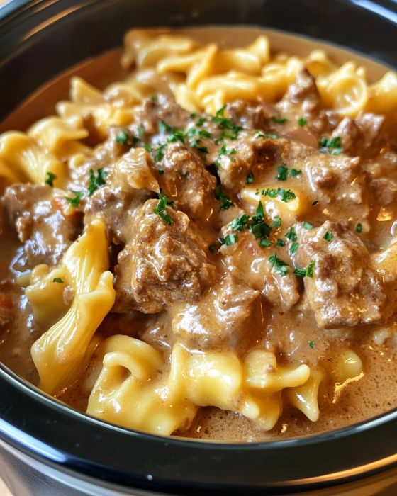 Slow Cooker Creamy Garlic Beef Pasta