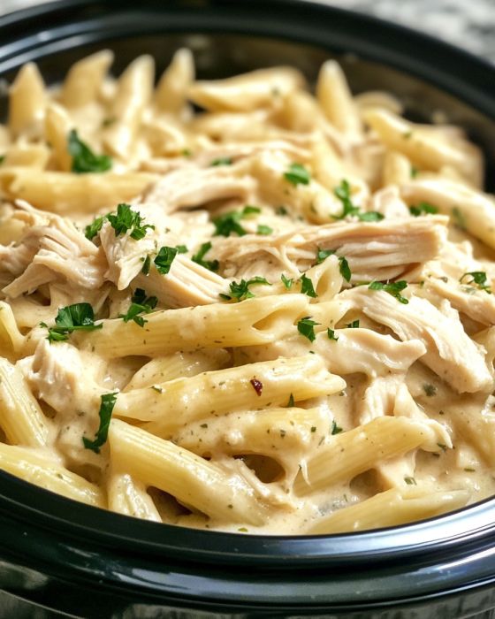 8. Add the cooked pasta to the slow cooker and stir to combine with the chicken and creamy sauce. Season with salt and pepper to taste.