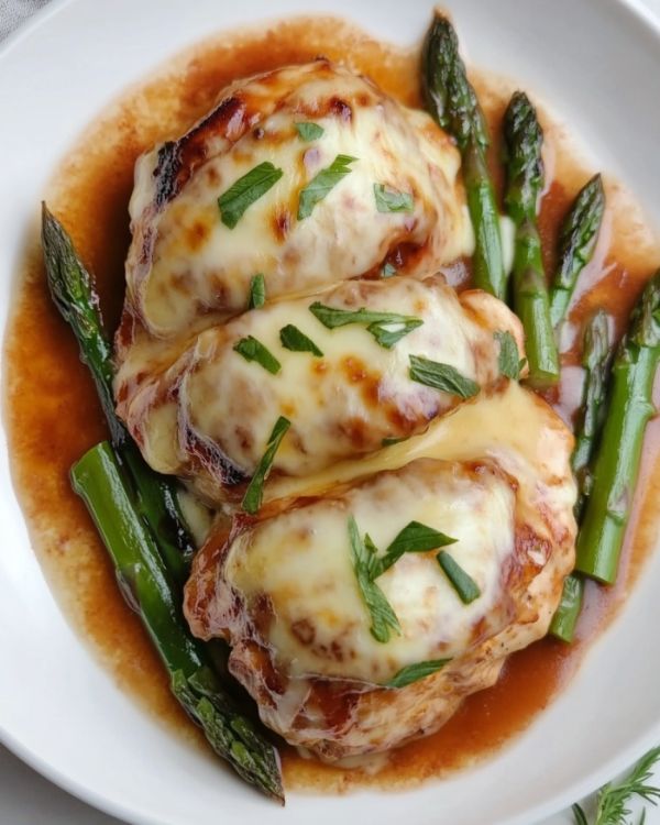 Serve the chicken and asparagus with a generous amount of sauce spooned over the top, garnished with fresh basil or parsley.