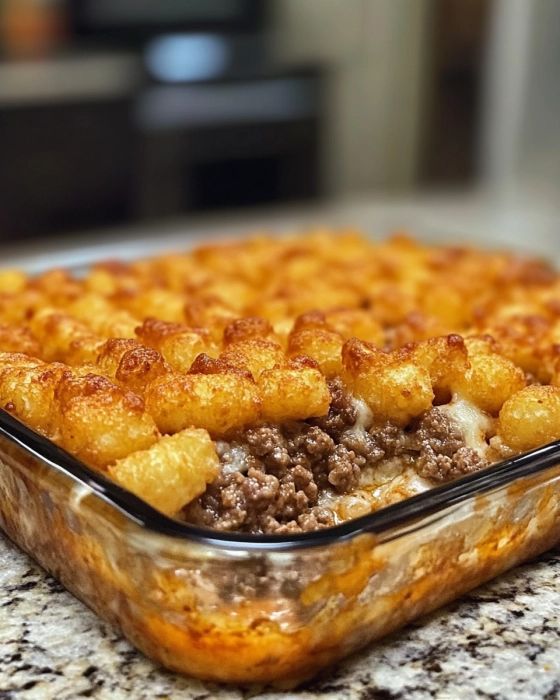8. Bake in the preheated oven for 45-50 minutes, or until the tater tots are golden brown and crispy.