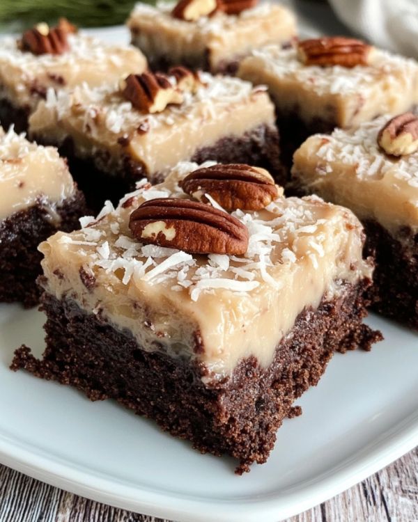 German chocolate fudge squares with coconut pecan icing are a delightful blend of rich, dense chocolate and creamy, nutty topping that takes me back to the heart of Midwestern gatherings. This recipe is a cherished family favorite, often gracing our table during special occasions and holidays. The origins of this dish can be traced back to the traditional German chocolate cake, but these squares offer a more portable and equally delicious version. Perfect for those who want to indulge in a nostalgic treat, these fudge squares are sure to bring warmth and joy to any gathering.