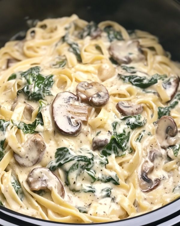 Slow Cooker Spinach and Mushroom Pasta Alfredo