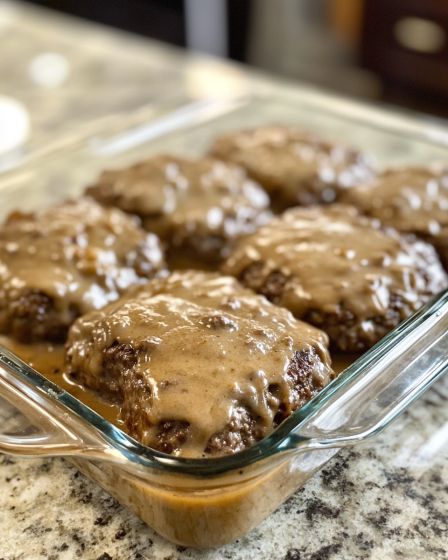 In a separate bowl, mix together the cream of mushroom soup and beef broth until smooth. Pour this mixture over the patties in the baking dish.
