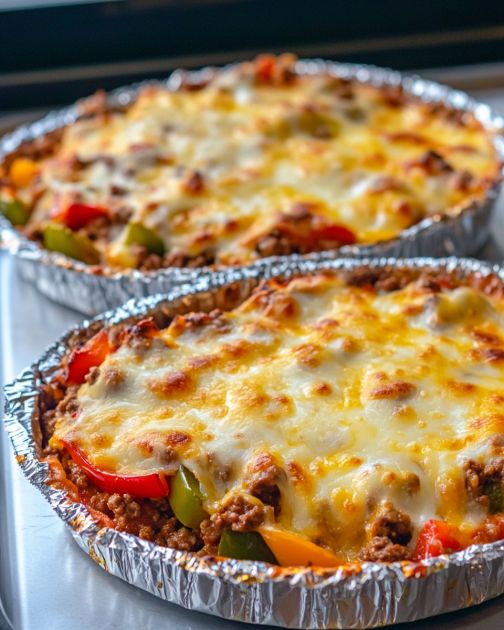 Divide the beef and pepper mixture evenly into two individual-sized aluminum foil pans.
