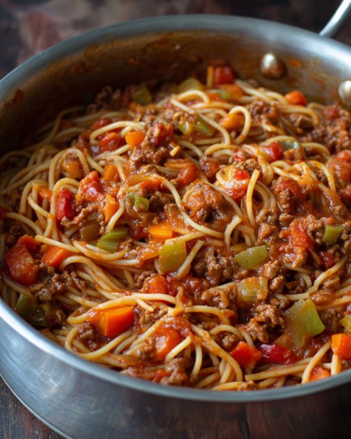 For a vegetarian version, omit the ground beef and add more vegetables such as zucchini or mushrooms. If you have picky eaters, you can blend the sauce to hide the vegetables before adding the spaghetti. For a spicier kick, add a pinch of red pepper flakes. You can also substitute ground turkey or chicken for the beef for a lighter option.
