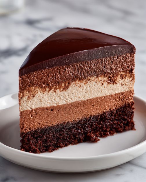 For a different flavor profile, consider adding a tablespoon of espresso powder to the cake batter to enhance the chocolate flavor. You could also incorporate a layer of fruit preserves, such as raspberry or orange, between the cake and mousse layers for a tart contrast. For those with dietary restrictions, try substituting the heavy cream with coconut cream for a dairy-free version, or use gluten-free flour for the cake base. To add a decorative touch, top the glaze with chocolate shavings or fresh berries before serving.
