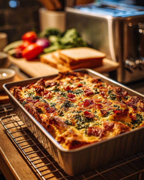 For a vegetarian version, simply omit the bacon and add more vegetables such as sautéed mushrooms or bell peppers. You can also experiment with different cheeses, like Swiss or Gruyère, for a unique flavor profile. If you prefer a bit of spice, add a pinch of red pepper flakes or a dash of hot sauce to the egg mixture. Consider using a variety of bread types, such as sourdough or whole grain, to add different textures and flavors to your strata.