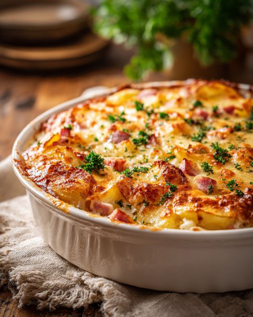 This comforting oven-baked ham and cheese potato bake is a family favorite in our household. It’s a classic Midwestern dish that warms the heart and fills the belly. Layers of tender potatoes, chunks of savory ham, and gooey cheese come together to create a meal that’s sure to please. Perfect for using up leftover ham, this dish is both economical and satisfying, making it a go-to for gatherings and weeknight dinners alike.