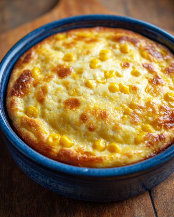 This corn and cheese pudding pairs wonderfully with simple, homey sides. Serve it next to roasted chicken, baked ham, or meatloaf for a classic comfort meal, or tuck it alongside grilled sausages and a green salad in the summer. A crisp side salad with a tangy vinaigrette or some steamed green beans helps balance the richness, while warm dinner rolls or cornbread make it feel extra special. For brunch, it works beautifully with scrambled eggs, fresh fruit, and coffee. If you’re feeding kids, add some carrot sticks or apple slices on the side—easy, colorful, and familiar.