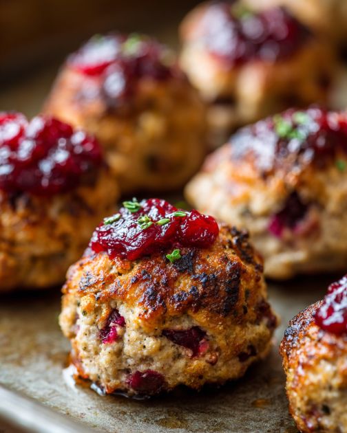 Working with one portion at a time, flatten it slightly in your palm, place about 1 teaspoon of cranberry sauce in the center, and carefully wrap the turkey mixture around it, sealing the cranberry inside. Roll gently into a ball and place on the prepared baking sheet. Repeat with the remaining portions and cranberry sauce.
