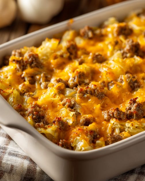 To keep the spirit of a 4-ingredient farmhouse dish, think in terms of simple swaps rather than long additions. You can use ground pork, turkey, or a mixture of meats in place of the ground beef, depending on what you have on hand or what’s on sale—that’s very much in keeping with Amish and rural cooking traditions. If you’re not fond of cream of mushroom soup, cream of chicken or cream of celery will give you a similar cozy texture with a slightly different flavor. For a heartier, Sunday-style version, you can trade the shredded cheese for a topping of buttered breadcrumbs or crushed crackers (just toss them with a little melted butter and scatter over the top before the final bake). If your cabbage is especially large, don’t be afraid to mound it a bit—the casserole will cook down; you may just want to add a splash more water to the soup so there’s enough moisture. For a touch more savoriness without adding extra ingredients, brown the meat well and let a few bits get nicely caramelized in the pan; that deep, toasty flavor will carry through the whole dish. And if you’re cooking for someone who likes a bit of bite, you can serve it at the table with black pepper or a dash of hot sauce, letting each person season their portion as they like without changing the gentle, comforting base recipe.