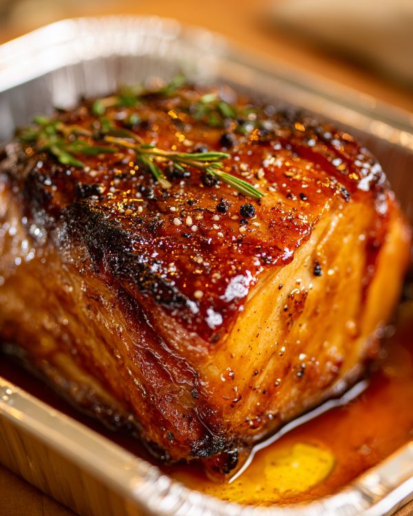 9. Let the turkey rest in the pan for 10–15 minutes before slicing. The juices and melted fat will pool in the bottom of the aluminum tray, forming a shiny, amber-colored sauce—perfect for spooning over each serving.