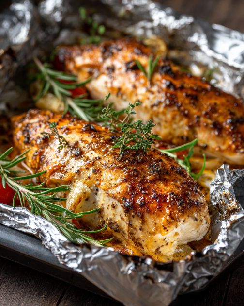 7. Transfer the baking sheet with the foil packet to the oven. Bake for 22–28 minutes, depending on the thickness of your chicken pieces, until the chicken is cooked through and reaches an internal temperature of 165°F (74°C).