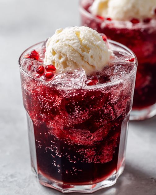 Top with ice cream: Using an ice cream scoop, gently place 2 generous scoops of vanilla ice cream on top of each drink. Aim for a nice rounded dome that sits above the rim of the glass, letting it just start to melt into the pomegranate layer below.