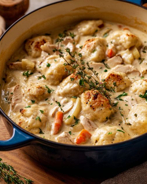 This creamy chicken and dumplings is hearty enough to stand on its own, but it shines even brighter with a few simple sides. A crisp green salad with a light vinaigrette helps cut through the richness and adds a bit of color to the plate. Steamed green beans or buttered peas are classic farm-style companions that don’t steal the spotlight. If you like a little extra starch, a slice of warm crusty bread or a pan of cornbread is lovely for sopping up the last spoonfuls of creamy broth. For dessert, something unfussy and old-fashioned—like baked apples or a simple dish of canned peaches—finishes the meal the way our mothers and grandmothers did, sweet but not showy.