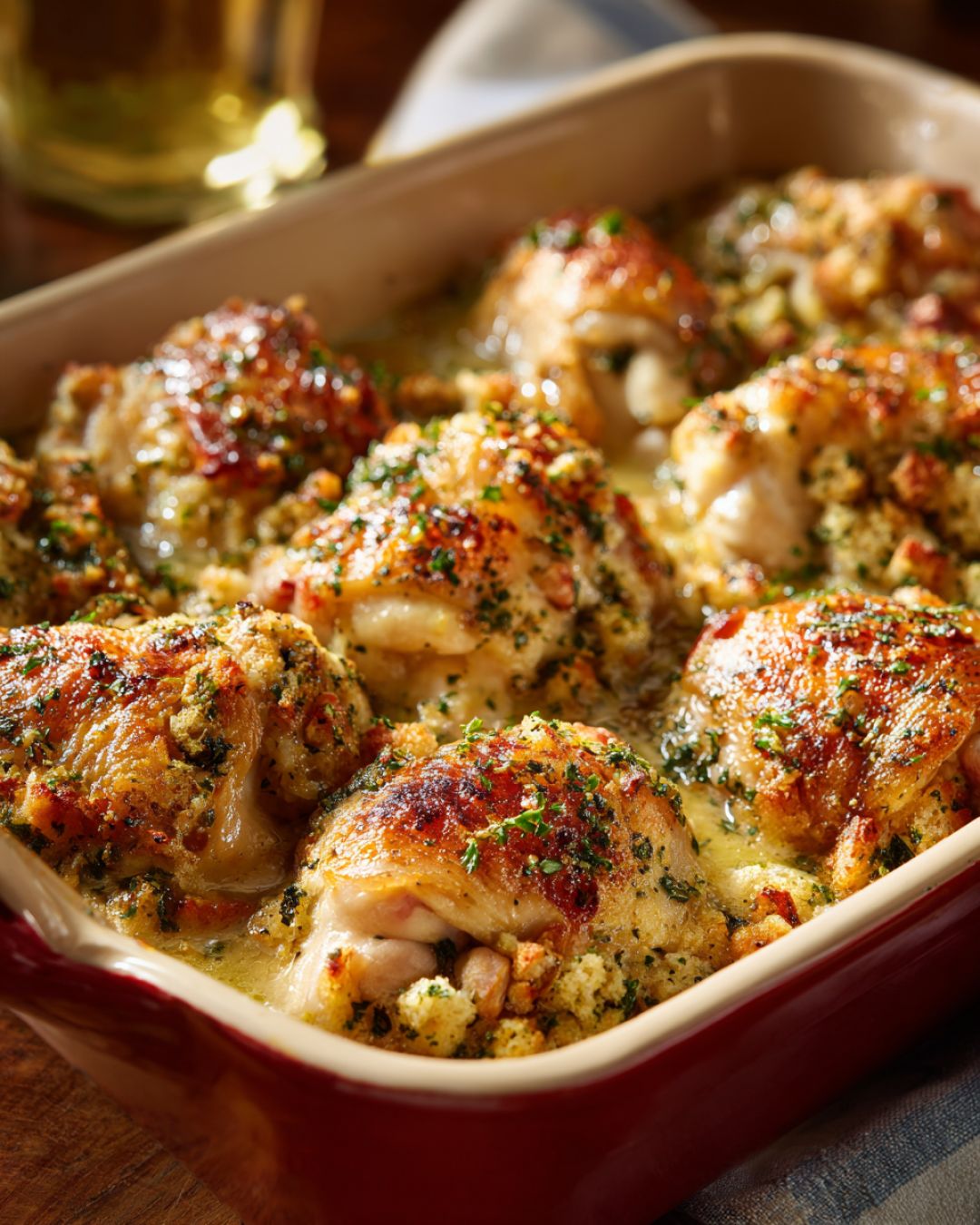 This baked chicken thigh casserole is one of those cozy, no-fuss dinners that feels like a hug at the end of a long workday. It’s basically juicy chicken thighs tucked under a buttery layer of stuffing mix, all baked together in one pan. Think of it as a shortcut version of a Sunday dinner—comforting like a holiday meal, but easy enough for a Tuesday night. I started making this when I was getting home late from the office and needed something I could throw together in 10–15 minutes, then let the oven do the rest while I answered emails or packed lunches for the next day. It’s the kind of recipe you make when you want real food, minimal dishes, and leftovers that still taste great the next day.
