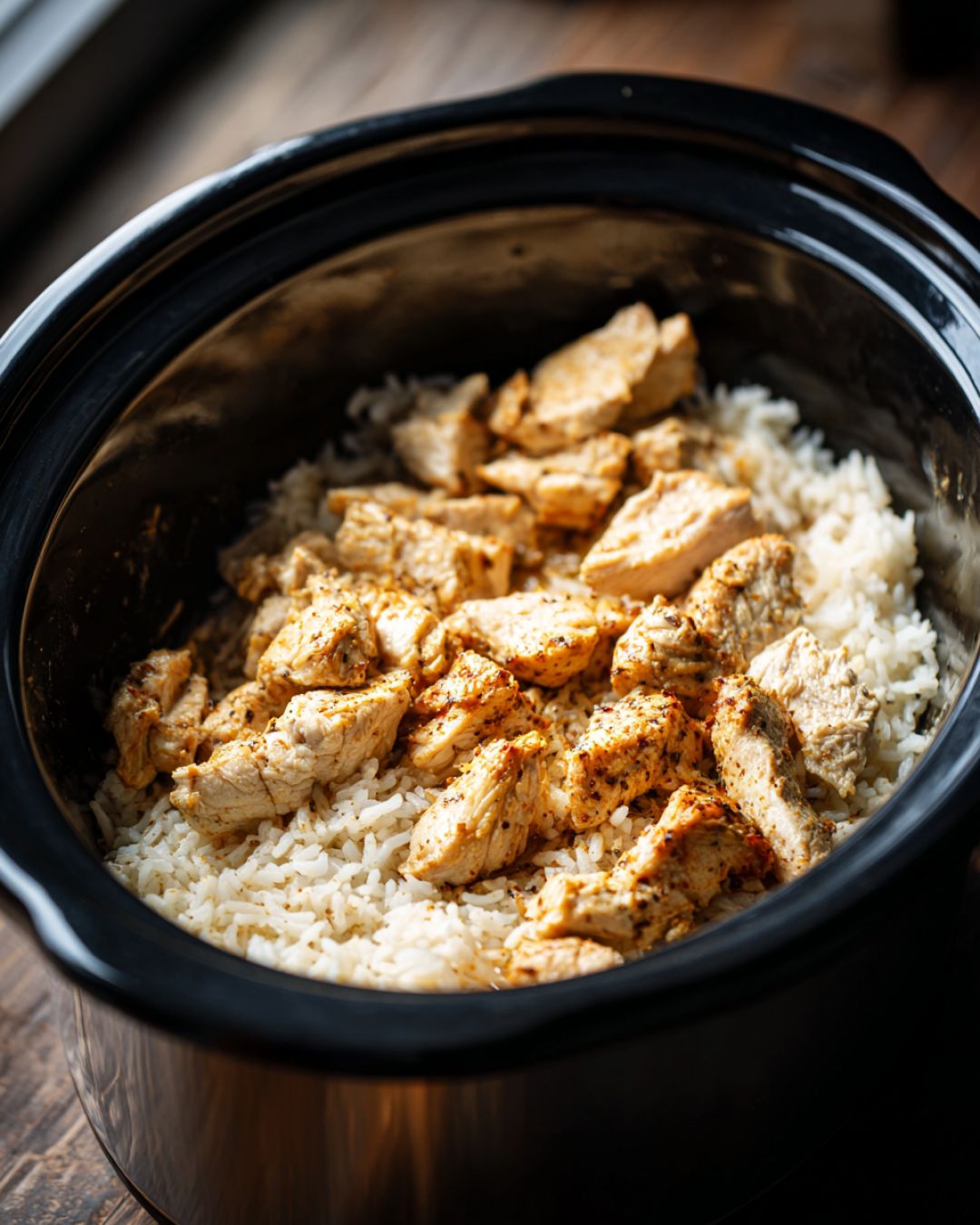 7. Cover the slow cooker with the lid and cook on LOW for 4–5 hours, or until the chicken is cooked through (internal temperature of 165°F / 74°C) and the rice is tender. Avoid lifting the lid during the first 3 hours, as that releases steam and can lead to unevenly cooked rice.