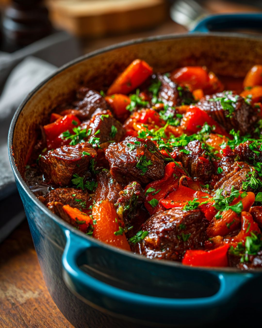 Beef stew is one of those universal comfort foods—nearly every cuisine has its own version, from French boeuf bourguignon to Hungarian goulash. This roasted red pepper beef stew leans a bit Mediterranean, with sweet, smoky peppers and a tomato base, but still feels very Midwestern in its heartiness. Roasting the peppers concentrates their natural sugars and adds a gentle smokiness that plays beautifully against rich, slow-simmered beef. If you’re looking for a stew that’s familiar enough for a Tuesday night but interesting enough for company, this is a great one to tuck into your rotation. It’s also a smart way to use jarred roasted red peppers you might have in the pantry, turning a simple beef stew into something with a bit more character and depth.