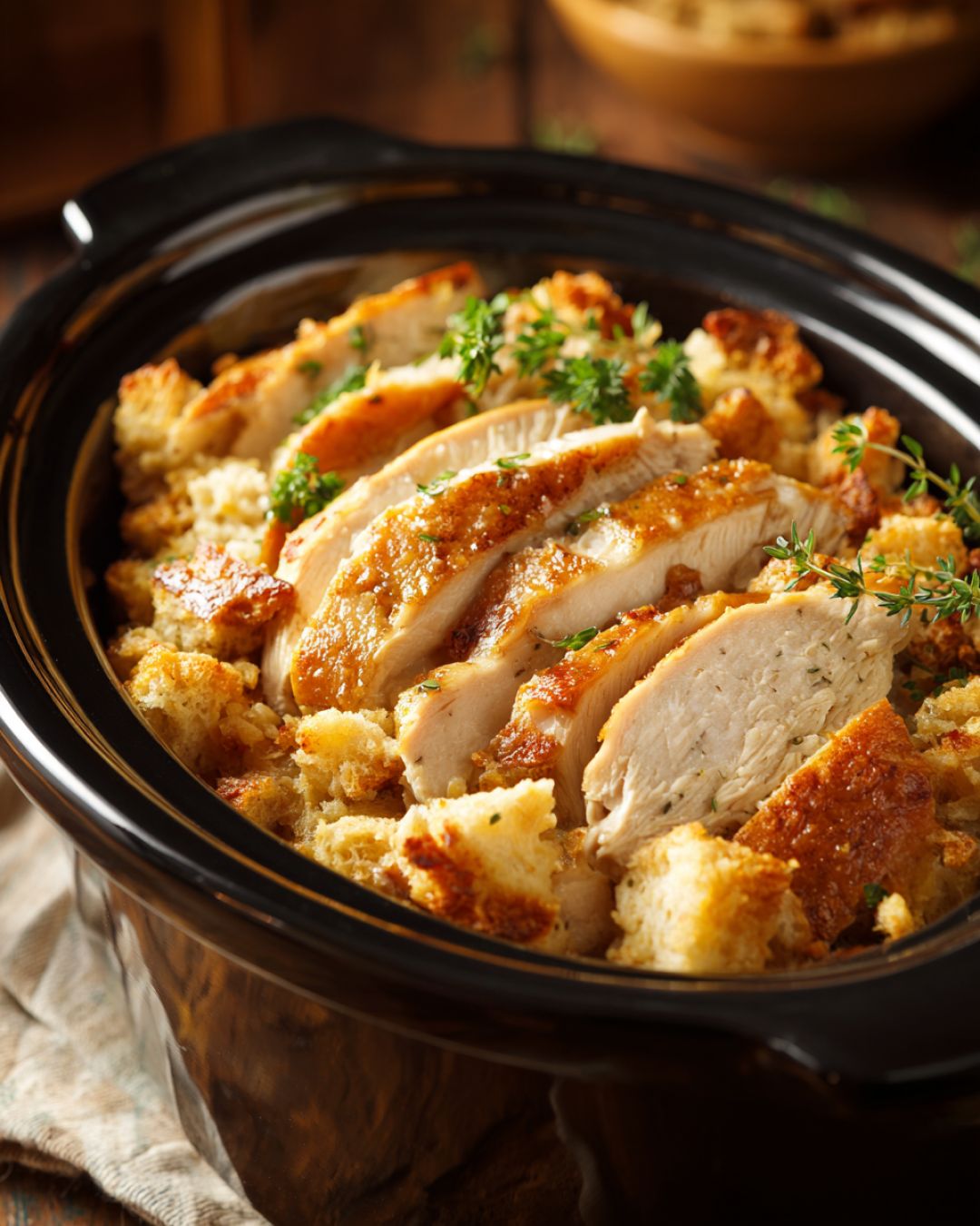 Once done, you can leave the chicken breasts whole or use two forks to gently shred or slice them in the slow cooker, mixing them lightly with the stuffing if you like a more casserole-style dish.