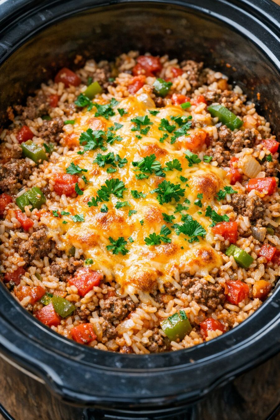 Out here in the country, a slow cooker beef and rice casserole is the kind of dish that quietly does you a favor. It bubbles away all afternoon while you’re out tending to the day, then greets you at suppertime like an old friend. This sort of recipe grew up alongside busy farm kitchens and church potlucks across the Midwest—simple ingredients, nothing fancy, but it fills the house with that cozy, onion-and-beef aroma that makes everyone wander into the kitchen asking when we’re eating. Ground beef, rice, tomatoes, and a few pantry staples come together into something that tastes like it took all day, even though the slow cooker did most of the work. It’s the kind of casserole you make when the weather turns cool, when you’ve got a lot on your mind and you just want dinner to be dependable, hearty, and familiar.