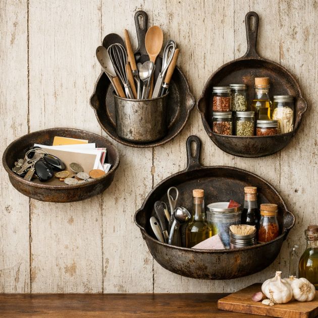 By hanging or stacking old cookware, you can create unique storage solutions for your kitchen. Use a shallow pan as a catch-all for keys, mail, or other small items. Alternatively, mount a series of pans on the wall and use them to organize utensils, spices, or other kitchen essentials. This not only gives new purpose to your old cookware but also adds a rustic, creative flair to your kitchen decor.
