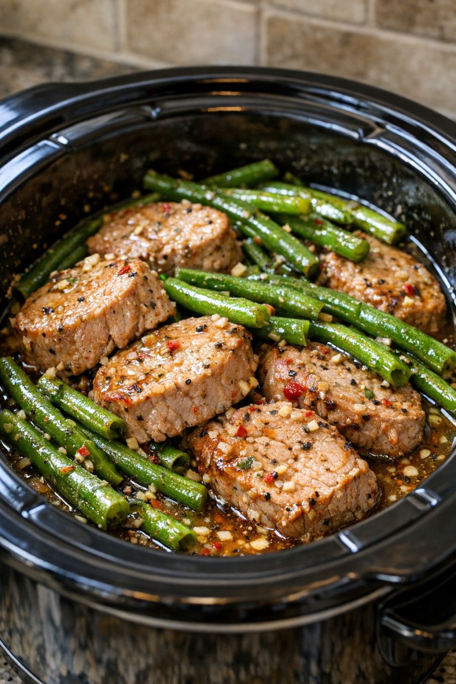 Once cooked, use two forks to gently shred or slice the pork right in the slow cooker, mixing it lightly with the green beans and juices.