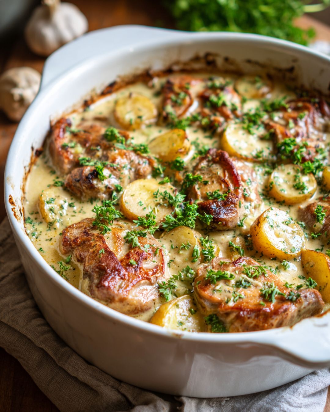 Rest and serve: Let the casserole rest for about 10 minutes after you take it out of the oven. This gives the sauce a chance to settle and thicken a bit. Sprinkle with chopped fresh parsley, if you like, then serve each pork chop with a generous scoop of the creamy potatoes and onions from the pan.