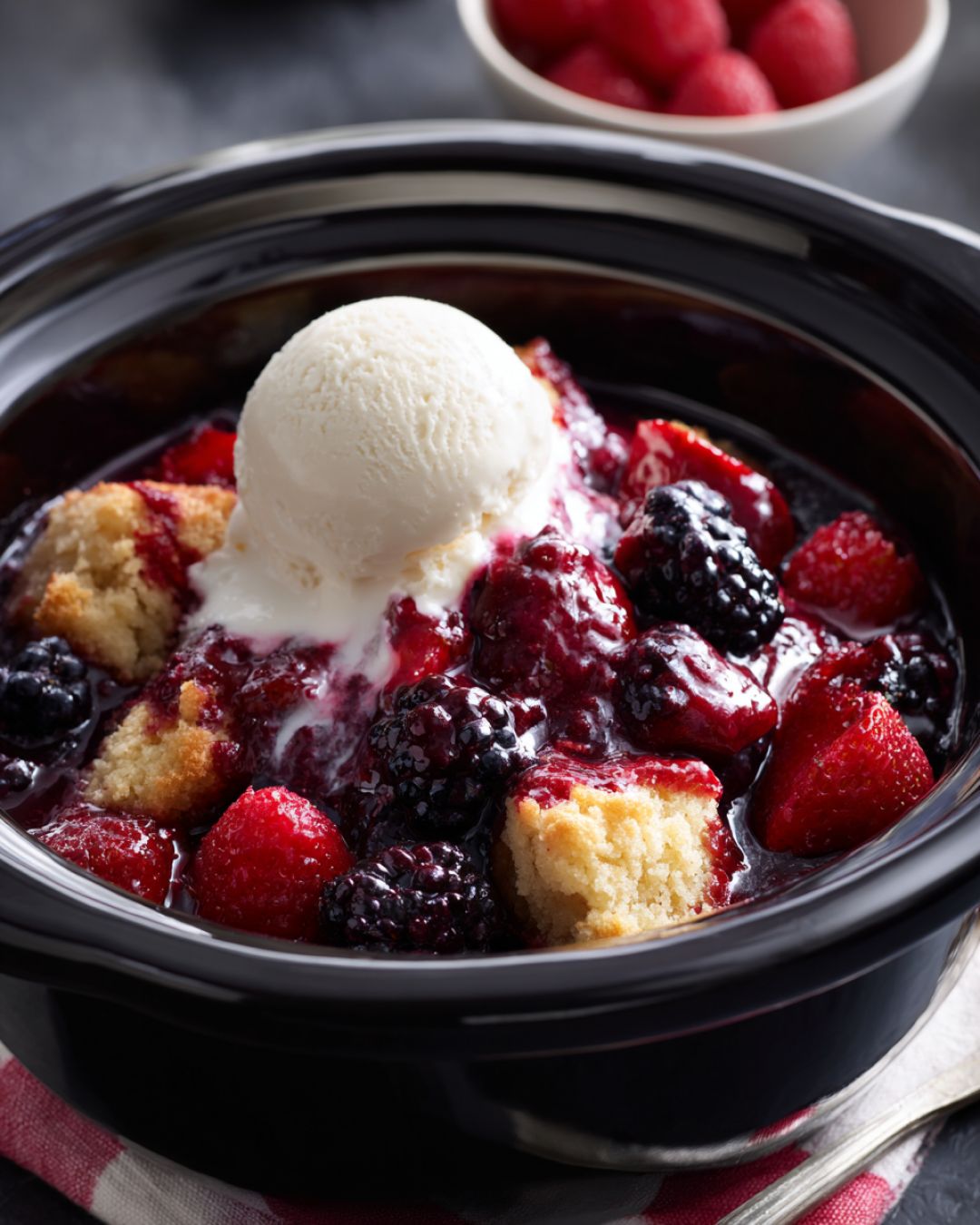 This berry cobbler is wonderful served warm right out of the slow cooker, spooned into bowls. A scoop of vanilla ice cream is the classic pairing—the cold cream melts into the warm berries and cake, making it extra special. If you prefer something lighter, a dollop of whipped cream or a spoonful of vanilla yogurt works nicely, too. For a more complete dessert spread, you can set out a little toppings bar with chopped nuts, mini chocolate chips, or granola so everyone can customize their bowl. It also pairs well with a simple cup of coffee or hot tea for the grown-ups and a glass of cold milk for the kids.