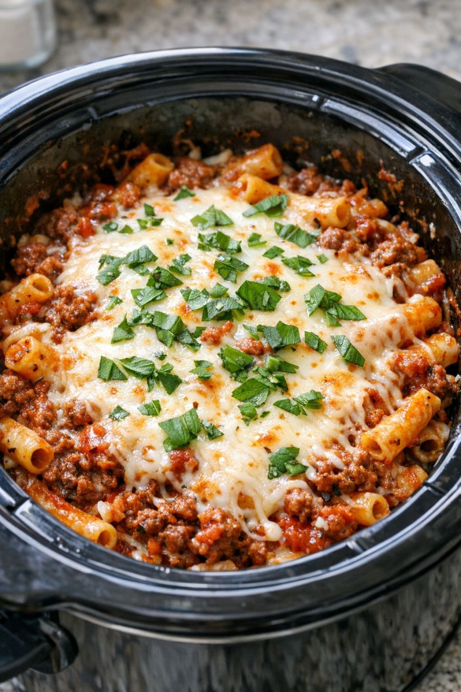 If your crew likes a little extra kick, stir a pinch of red pepper flakes or a spoonful of prepared Italian seasoning into the sauce before layering. You can swap the ground beef for Italian sausage or use half beef and half sausage for a deeper, old-fashioned Sunday-supper flavor. For a creamier bake, use all ricotta and add an extra handful of mozzarella on top during the last 15–20 minutes of cooking. Whole wheat or high-protein ziti works fine, but it may cook a bit faster, so start checking around the 2 1/2-hour mark. If your slow cooker tends to run hot, you can parboil the ziti for 4–5 minutes before layering to ensure even cooking. And if you’re feeding just a few people, halve the recipe and use a smaller slow cooker, or make the full batch and portion leftovers into freezer containers—this reheats beautifully for quick lunches or a no-work supper on a busy day.