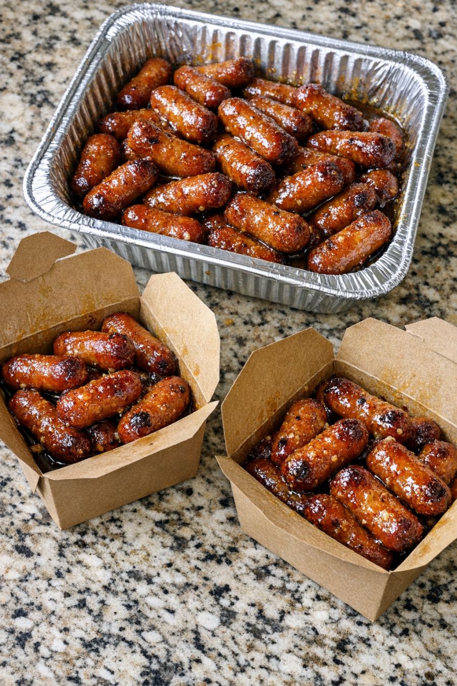 If you’re serving right away, set the disposable aluminum pan on your salt-and-pepper granite counter with a small spoon for extra sauce and a cup of toothpicks. If you’re packing some up, use a spoon to divide a portion of the glazed lil smokies and plenty of sauce into the paper takeout boxes. Serve warm, and expect people to keep circling back, “just grabbing one more,” until the pan is totally wiped out.