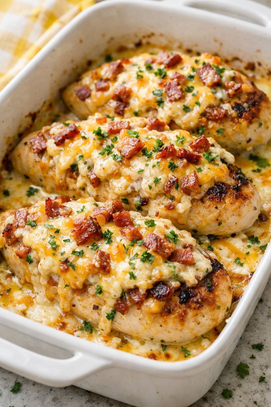If you like, sprinkle sliced green onions or chopped fresh parsley over the top for a pop of color and freshness. Serve the chicken breasts with spoonfuls of the creamy bacon-cheddar mixture and pan sauce from the casserole dish over the top or alongside your favorite sides.